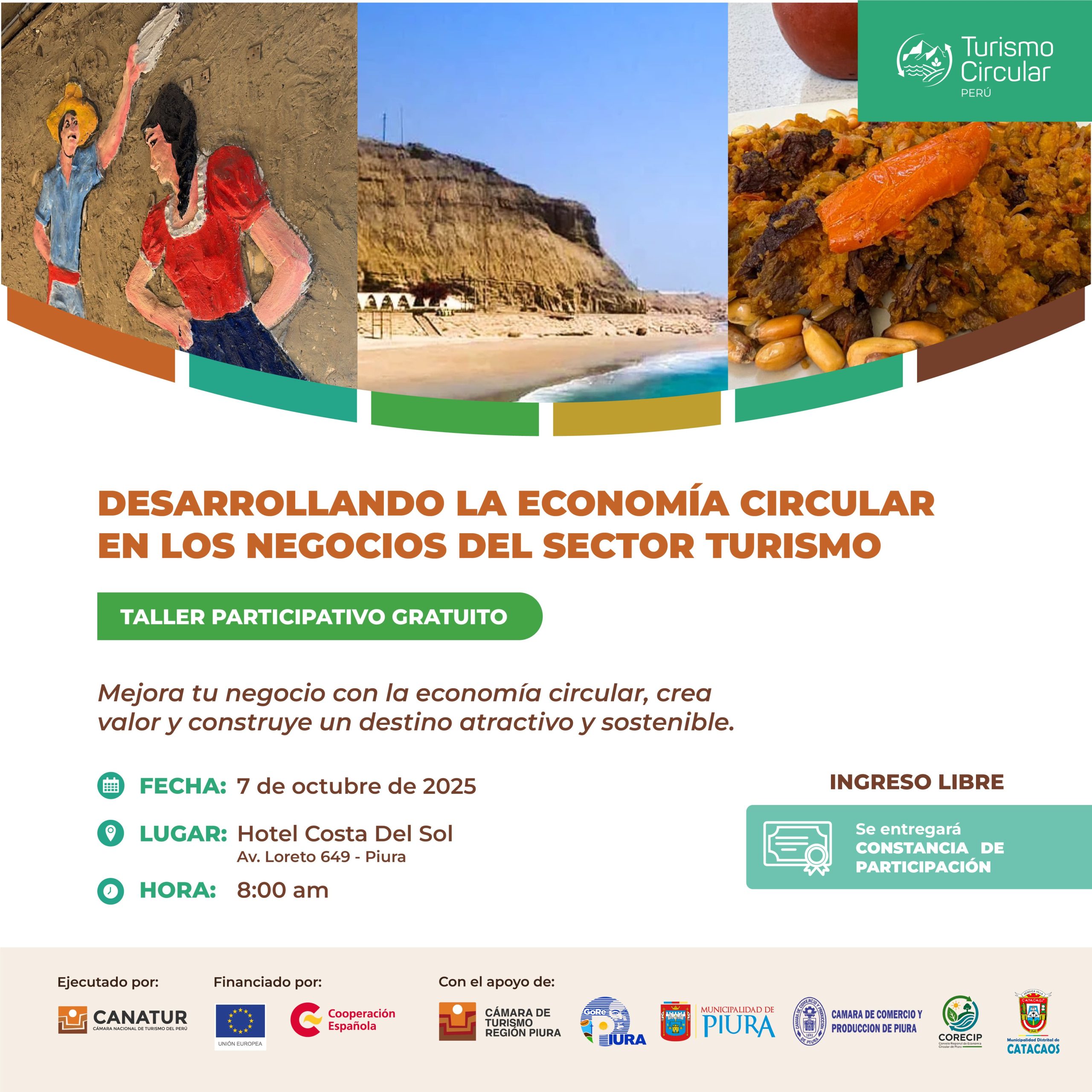 El taller cuenta con la colaboración de importantes instituciones locales: CADETUR Piura, DIRCETUR Piura, Municipalidad Provincial de Piura, Cámara de Comercio y Producción de Piura (CAMCO), Consejo Regional de Economía Circular de Piura (CORECIP) y la Municipalidad Distrital de Catacaos.
