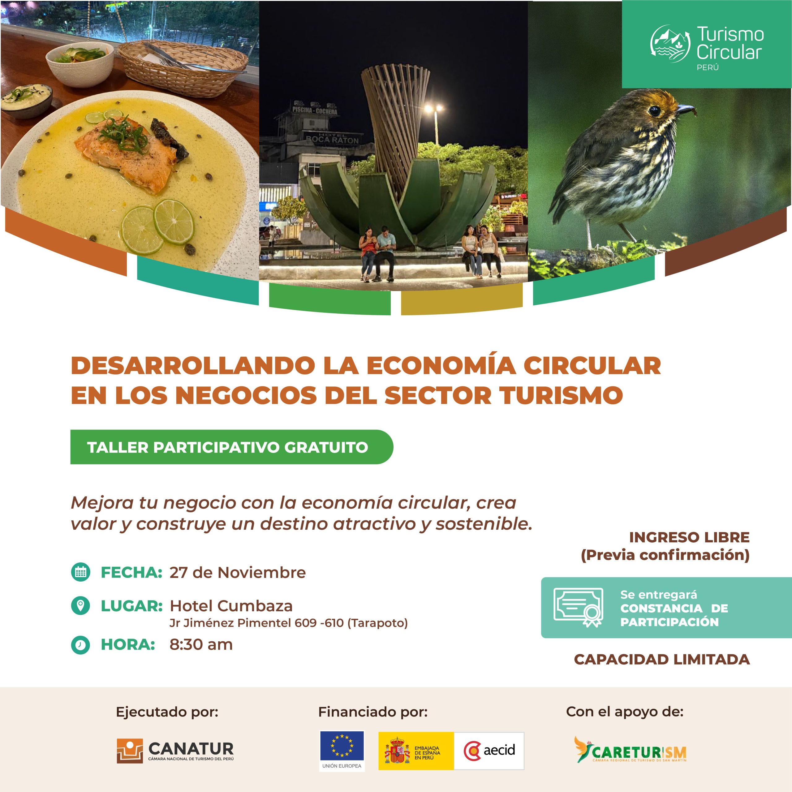 Con ese propósito, la Cámara Nacional de Turismo del Perú – CANATUR PERÚ, con el respaldo de la Unión Europea en Perú y la Agencia Española de Cooperación Internacional para el Desarrollo (AECID), organizan el taller gratuito “Desarrollando la Economía Circular en los Negocios del Sector Turismo”, dirigido a operadores, empresas, mypes y mipymes del sector turismo en Tarapoto – San Martín.